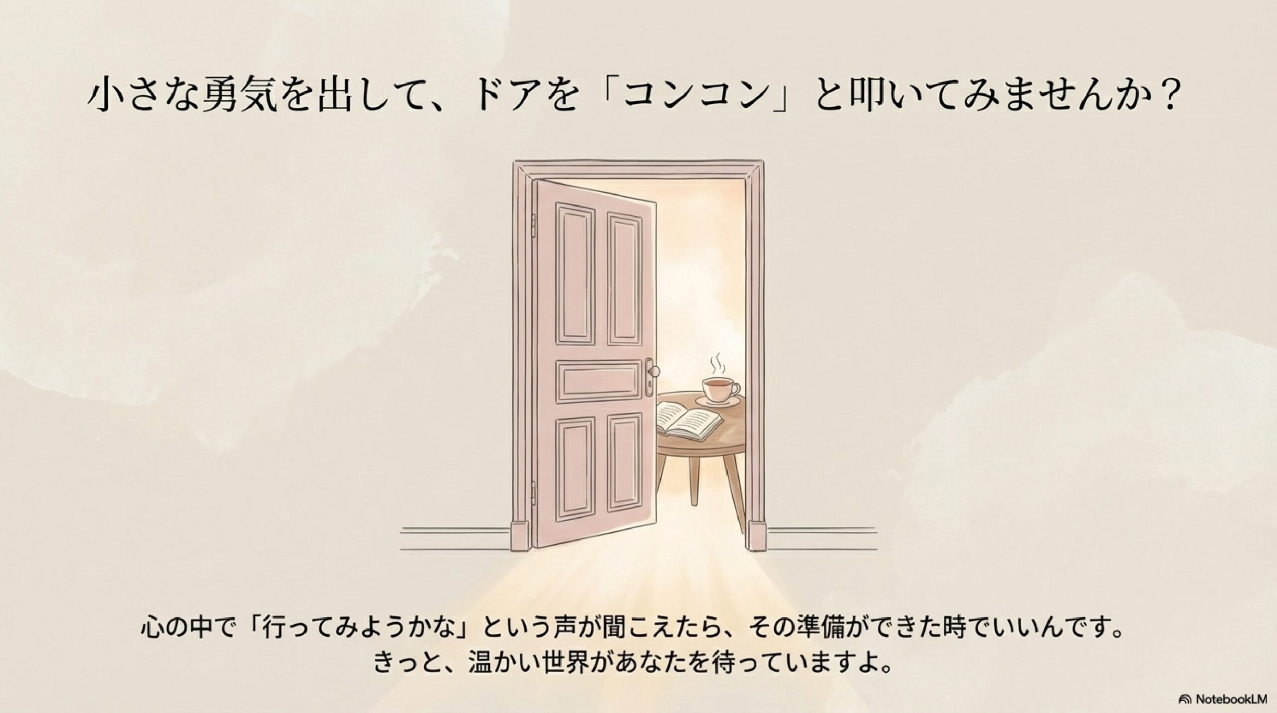 「小さな勇気を出して、ドアを『コンコン』と叩いてみませんか?」。少し開いたドアの奥に、本とコーヒーが置かれた温かい雰囲気のテーブルが見えるイラスト。