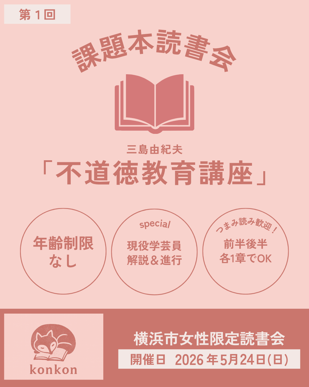 三島由紀夫って実はユーモアたっぷり!?『不道徳教育講座』の爆笑エピソードと魅力をたっぷり解説。5月開催の横浜・女性限定読書会konkonの課題本です。初心者大歓迎、2章読むだけでOK!文豪の意外な素顔についてカフェで楽しく語り合いましょう。